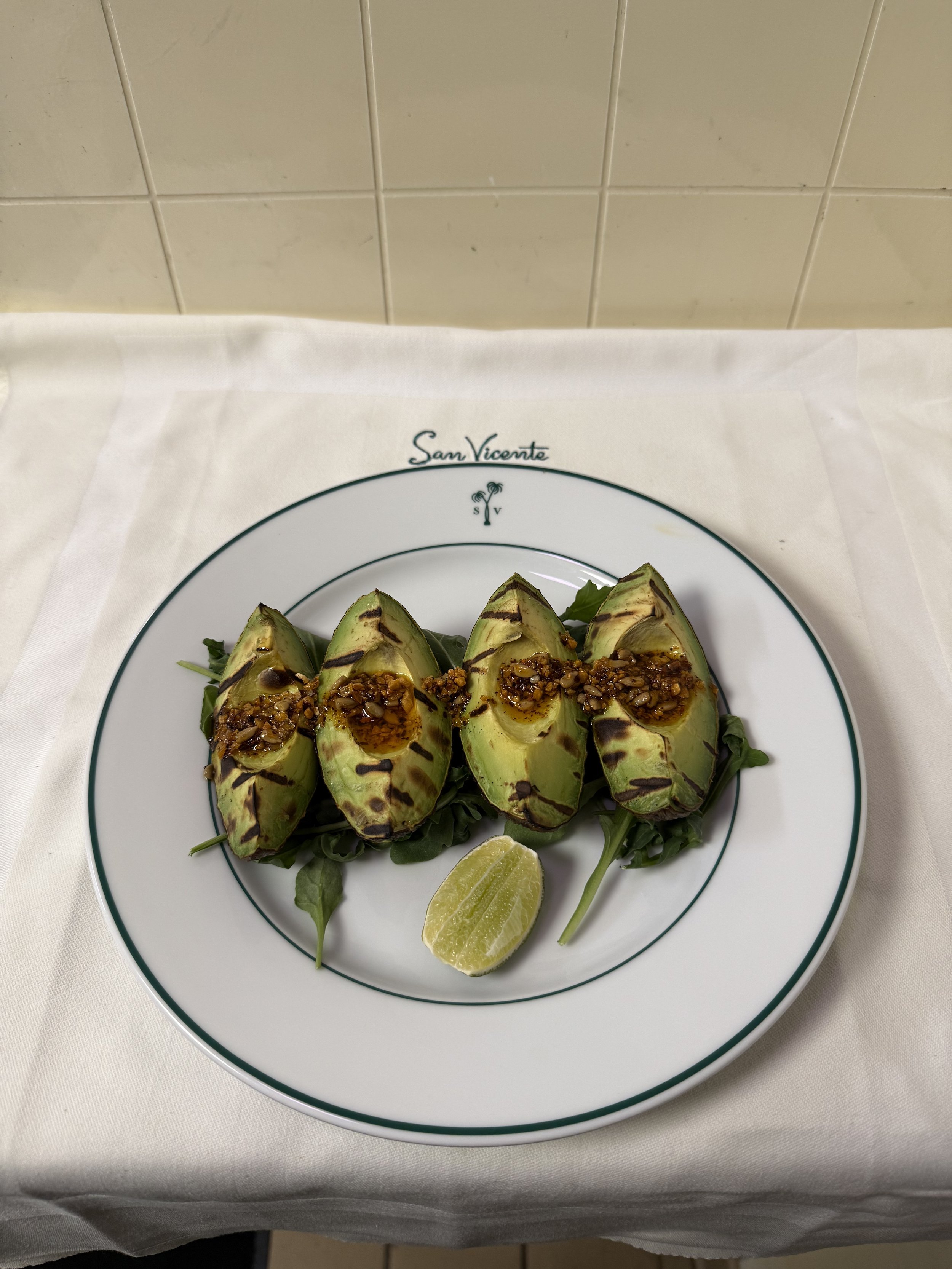 Grill skin side up. On a small plate, place spread arugula and then place grilled avocado on top. Drizzle XO Sauce down the center of the avocado.
