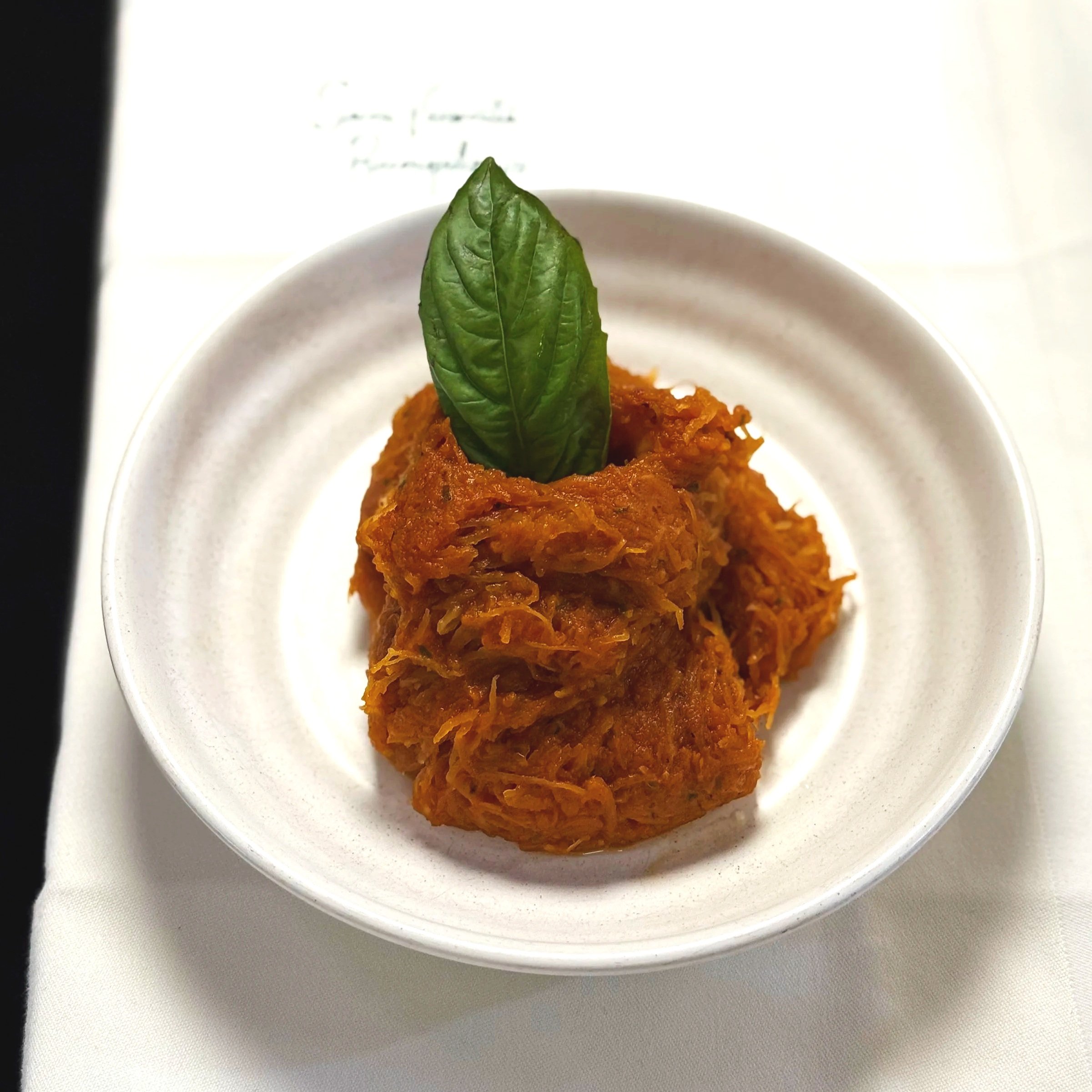 In a saute pan add squash pomodoro portion and marinara sauce cook over med high heat until combined and warmed through. Taste, adjust seasoning if needed. To plate put squash in the middle of the bowl and create a small well in the middle, put basil oil in the well and garnish with large basil leaf